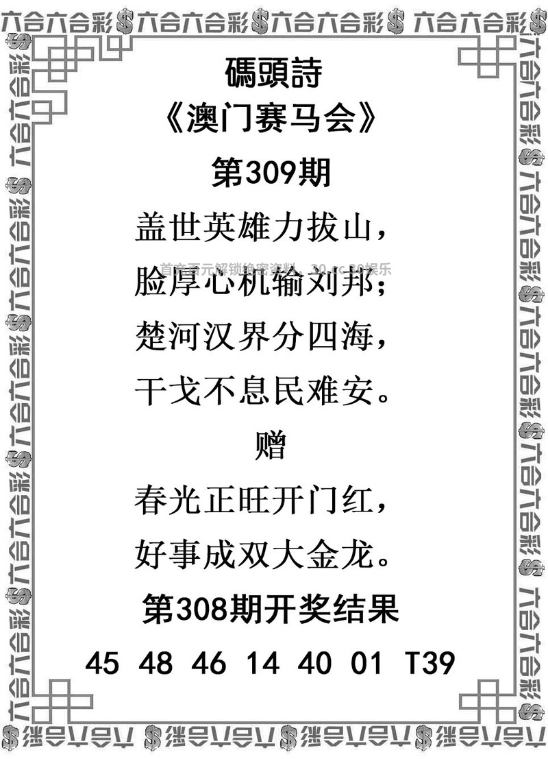 | 309期解析:盖世英雄力拔山,脸厚心机输刘邦,楚河汉界分四海,干戈不息民难安。 综合生肖:羊马狗鸡鼠蛇牛 |